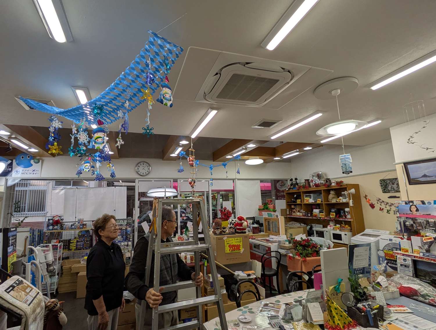 脚立に登って高い所の飾りを付ける夫とそれを見守る妻❤️