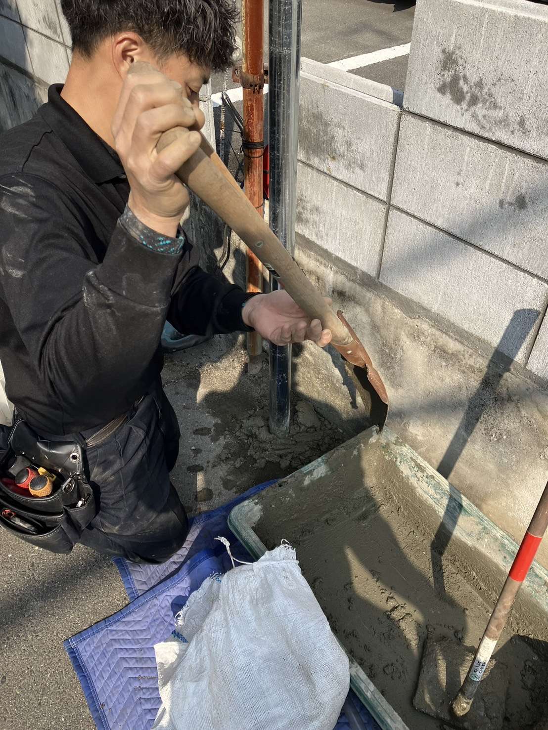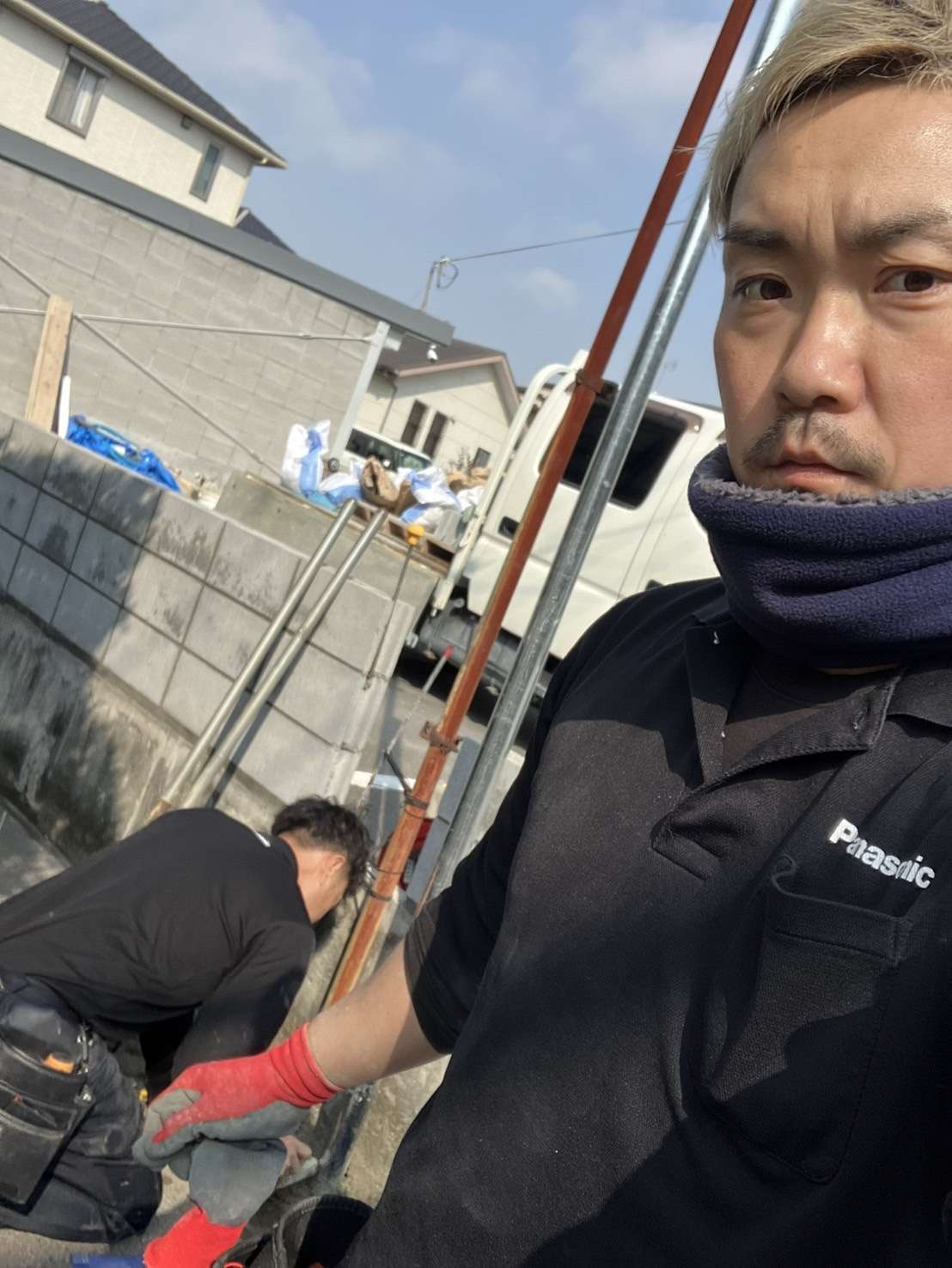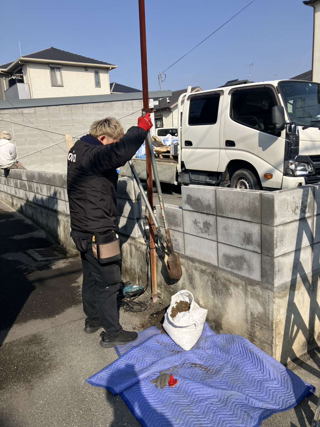 そこへあの長いポールを立てて、セメントを流し込む社長。